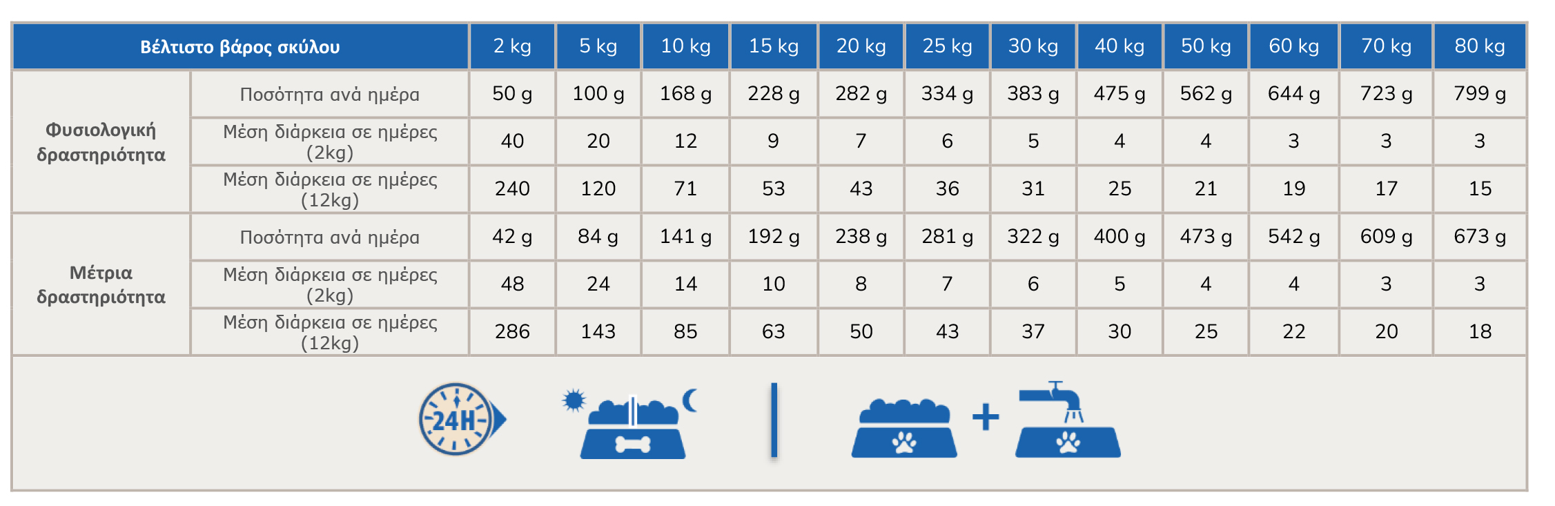 Για ομαλή μετάβαση από την προηγούμενη τροφή, σερβίρετε σταδιακά τις νέες κροκέτες, ως έχουν ή ελαφρώς μουλιασμένες σε χλιαρό νερό, σύμφωνα με τον πίνακα συνιστώμενης ημερήσιας πρόσληψης (βλ. και συσκευασία). Η ημερήσια ποσότητα κατανάλωσης προσαρμόζεται ανάλογα με το σωματικό βάρος και τη δραστηριότητα κάθε σκύλου. Βεβαιωθείτε ότι υπάρχει πάντα διαθέσιμο φρέσκο πόσιμο νερό.